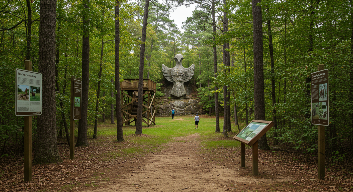 Rock Hawk is a stone effigy in Eatonton, GA that holds hundreds of displays and miles of trails surrounding the effigy. Visitors can view the effigy from a viewing tower as well as read educational displays about the 12,000-year history of the land. Rock Hawk also offers recreational opportunities such as camping, fishing, hiking, biking, archery, boating, and nature watching.